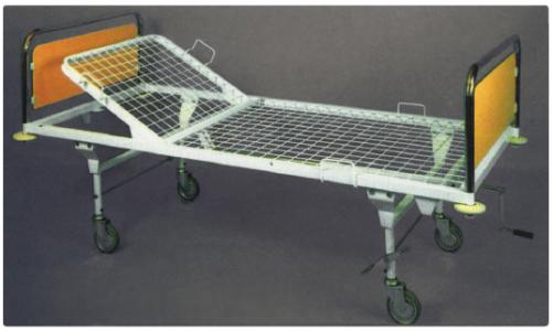 Νοσοκομειακό κρεβάτι νοσηλείαςΧειροκίνητο, Μονόσπαστο, Σταθερού ύψους.Ανύψωση πλάτης με 1 μανιβέλαΡόδες διαμέτρου 125X32mm με φρένο (Προαιρετικά)