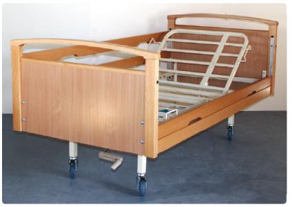 Κρεβάτι νοσηλείας με ξύλινη επένδυσηΜονόσπαστο, Σταθερού ύψουςΑνύψωση πλάτης με μηχανισμό μανιβέλας.Ξύλινη επένδυση και πλαϊνά από ξύλο μασίφ.Ρόδες διαμέτρου 100X32mm με φρένο
