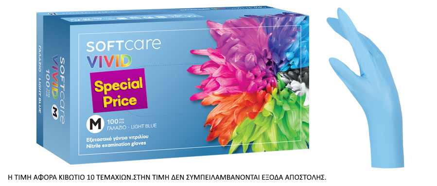 Εξεταστικά γάντια Soft Care Vivid Γάντια Νιτριλίου χωρίς πούδρα, κατασκευασμένα από 100% νιτρίλιο (χωρίς latex). Τεμάχια συσκευασίας: 100