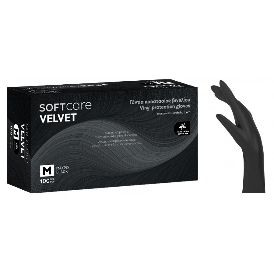 Γάντια βινυλίου Soft Care Velvet χωρίς πούδρα, σε μαύρο χρώμα.